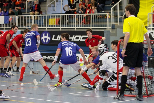 Depuis l’ouverture du score, les Français rencontrent de grandes difficultés à cadrer leurs frappes. Mais à la 47e minute, Michel Neumuller, impact player de cette équipe, prend sa chance, totalement excentré, et loge un tir puissant dans la première lucarne. Il rééditera l’exploit à l’identique, 10 minutes plus tard, pour l’égalisation française à 4-4. Entre temps, Manaüre Russo-Mendoza est exclu 2 minutes pour une crosse haute très litigieuse, le scenario tourne mal. Mais la maison bleue résiste, la pénalité est effacée et peu après son retour sur le terrain, profitant d’un pressing très efficace de Florent Rivoire, Capitaine Mana trouve lui aussi la lucarne pour égaliser à 3 partout. C’est au moment où l’on croit la machine lancée à pleine vitesse que les Belges, contre le cours du jeu, font ressortir le diable de la boite et trouvent le moyen de reprendre la tête, sur un nouveau contre alors que les Bleus viennent de frapper le poteau : 3-4 (54e). Vient donc ensuite l’égalisation de Michel Neumuller, peu avant un coup-franc improbable ! Nous sommes à mi-terrain et la combinaison de départ proposée par la ligne 1 française a fière allure. La frappe qui s’en suit un peu moins mais elle est déviée par Alexis Boren qui lobbe miraculeusement, soyons sincères, l’excellent gardien rouge.