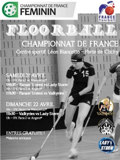 Le retour ou plutôt les retours puisque ce week-end, à Paris, se tiendront les matchs retours du tout premier championnat féminin. Et c’est à l’issue de cette seconde manche que sera donc attribué un trophée historique. Pour le moment ce sont les Valkyries qui tiennent la corde. Ces dames seront donc à l’honneur ce week-end à Paris, et pour elles il s’agira déjà du 2e tour. Rappelons que la FFFL a lancé cette saison un tout premier championnat féminin officiel qui réunit trois formations aux allures de sélections régionales puisque rassemblant chacune des joueuses de différents clubs. Les Valkyries représentent le Nord de la France (Amiens, Tourcoing et Wasquehal) et elles ont remporté leurs deux premiers matchs. Les scores de 5-2 et de 4-0 témoignent d’un joli potentiel offensif. Ces femmes du Nord sont donc très bien parties, mais on l’aura compris, il s’agit d’une compétition courte en forme de sprint, et elles ne sont pas à l’abri d’un retournement de situation aussi soudain que définitif. Attention aux Parisiennes de Panam’United, joint-venture entre le PUC et IFK Paris, dont la centre slovaque Barbora Sutarikova est actuellement en tête du classement des buteurs avec 3 réalisations. Les joueuses de la capitale tenteront donc de refaire leur retard, au même titre que le Lady Storm, escouade féminine au profil géographique élargi, allant de Nancy à Marseille, mais au coeur rhône-alpin. A noter : cet événement sera retransmis par la webradio du LFC qui met en place un dispositif exceptionnel dont elle a le secret. Plus d’informations et le lien vers le "live" sur le site du LFC. Voilà pour le contexte de ce nouveau grand rendez-vous pour le floorball français. Mesdames, à vous de jouer ! PROGRAMMEJ3 : Samedi 21 Avril, Paris