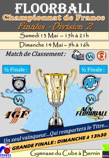 Après une palpitante première phase de playoffs, la Division 2 s’apprête à livrer son verdict ce weekend. L’affiche de ces 1/2 finales : Caen Floorball VS Nantes Floorball Rouen Floorball VS Tigres - Isere Gresivaudan Floorball => Les 1/2 finales auront lieu ce samedi à Bernin (38) => Les deux finalistes seront directement promus en Nationale 1 => La finale et la petite finale auront lieu dimanche à Bernin (38) => L’équipe 2 de l’IGF ne peut pas monter, puisque son équipe première évolue déjà en en Nationale 1