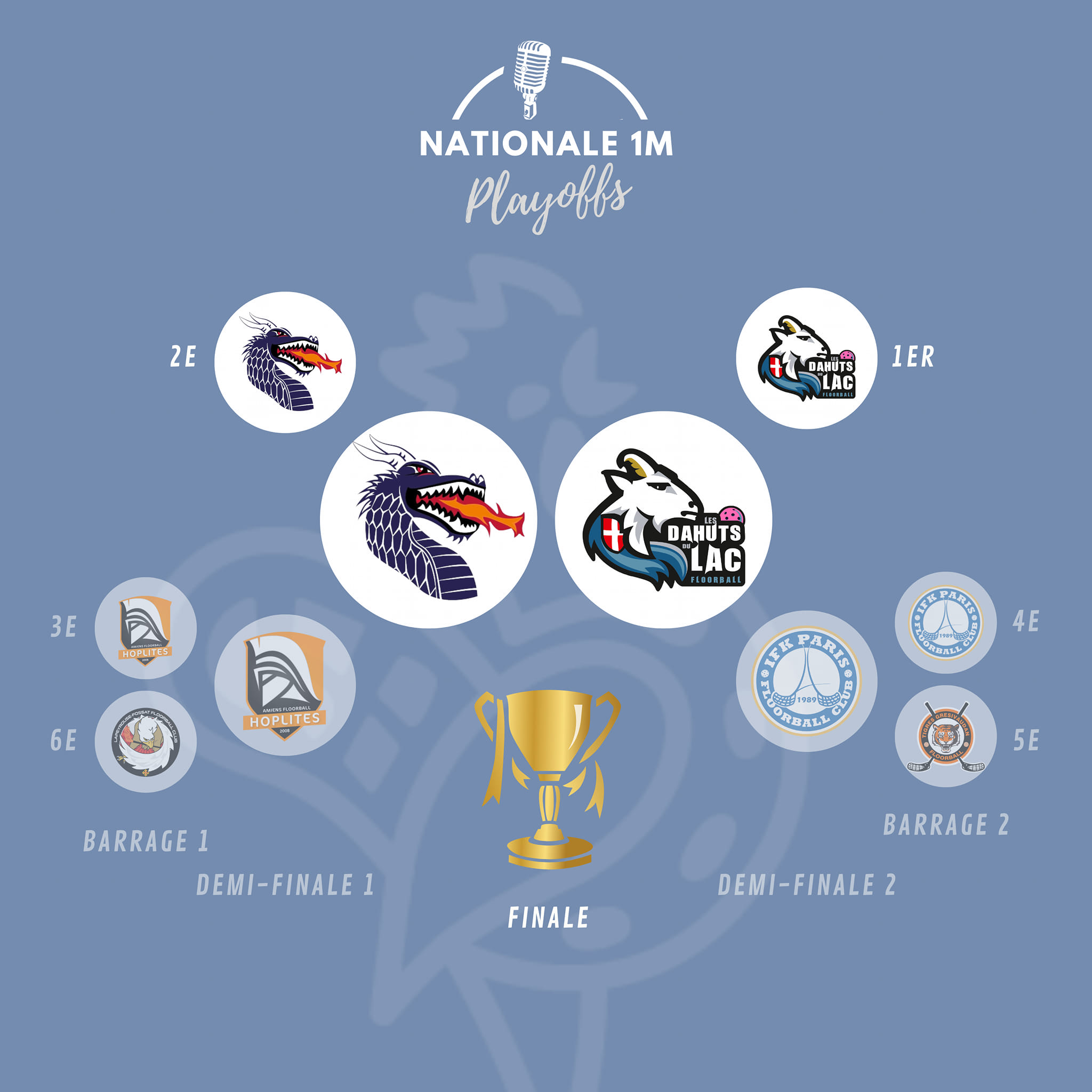 Gardienne : Lucie Thévenet. Finale de Nationale 1 masculine : Dragons bisontins - Dahuts du lac Samedi 8 juin à 20h Tableau des play-offs On prend les mêmes et on recommence ! Pour la 3e année consécutive, Besançon et Sevrier se retrouvent en finale de N1. Après 2 finales exceptionnelles en 2022 et 2023, toute la France du floorball attend ce match de pied ferme.