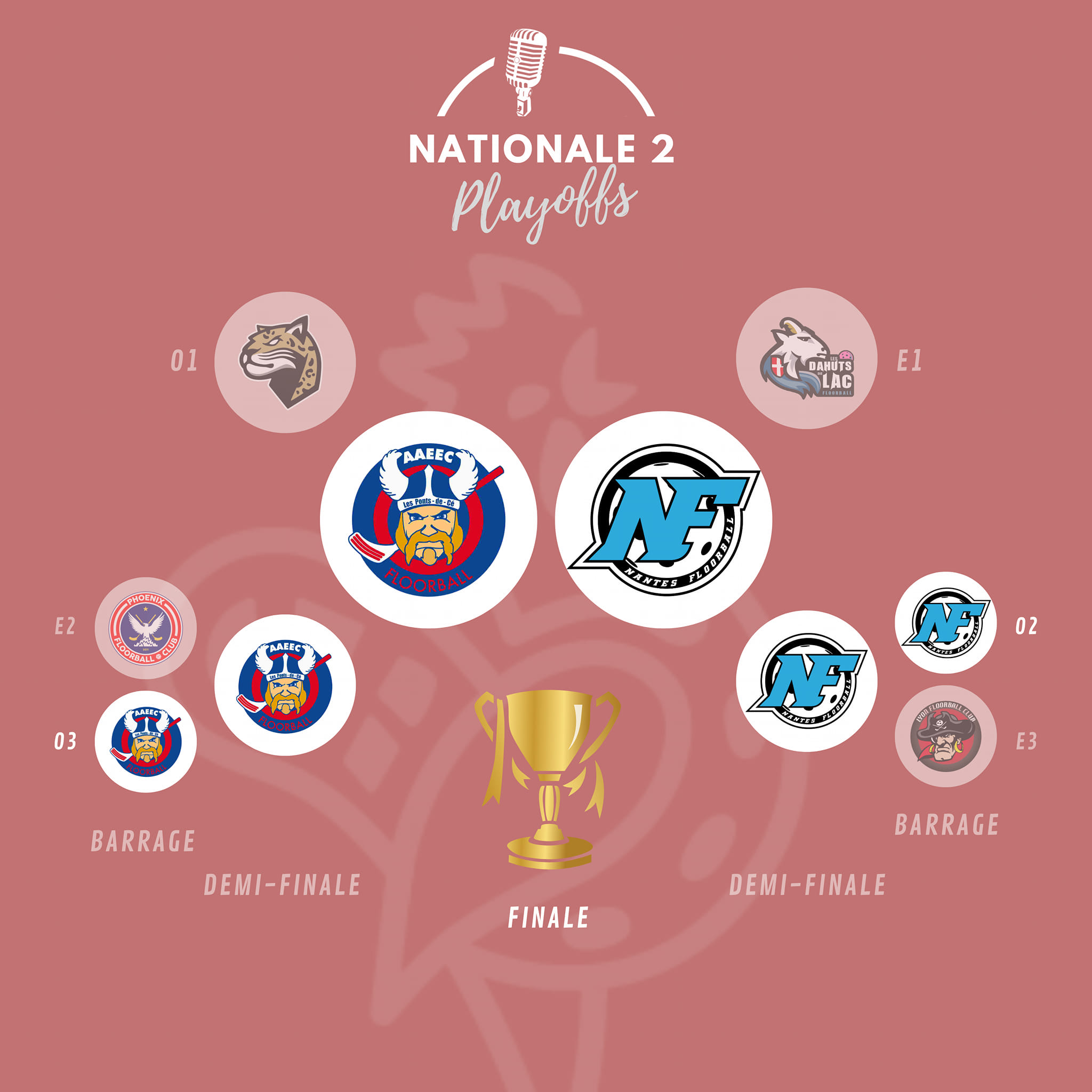 Programme des finales 2024 à VesoulLes matchs se dérouleront au gymnase Jean Jaurès de Vesoul. Finale N2 hommes : AAEEC Ponts-de-Cé - Nantes floorball Samedi 8 juin à 14h Tableau des play-offs (image : le Rink) Deux équipes de la poule Ouest se retrouvent cette année en finale de la Nationale 2, et ce n’est pas forcément celles que l’on attendait ! Les Andégaves des Ponts-de-Cé et le Nantes floorball ont obtenu de haute lutte leurs tickets pour cette finale et sont d’ores et déjà promus en Nationale 1 pour la saison prochaine. Une grande première pour les Ponts-de-Cé, félicitations à eux ! Pour en arriver là, Nantes a terminé 2e de la poule ouest en saison régulière avec notamment une très bonne défense et un excellent gardien, tandis que Ponts-de-Cé terminait 3e et empochait de justesse la dernière place qualificative pour les play-offs. Les deux équipes se sont surpassées en play-offs avec des performances remarquables. Nantes s’est défait du Lyon floorball club en quart de finale (4-3 ; 6-3) puis a éliminé le leader de la poule est Les Dahuts du lac 2 (7-3 ; 3-3) ! En quart de finale, les Ponts-de-Cé battent les Phoenix de Wasquehal (3-1 ; 5-4) puis réalisent un véritable exploit avec une remontada au match retour contre Caen, leader incontesté de la poule ouest (3-6 ; 6-2). Pour cette finale, les deux équipes compteront sur leurs joueurs clés.