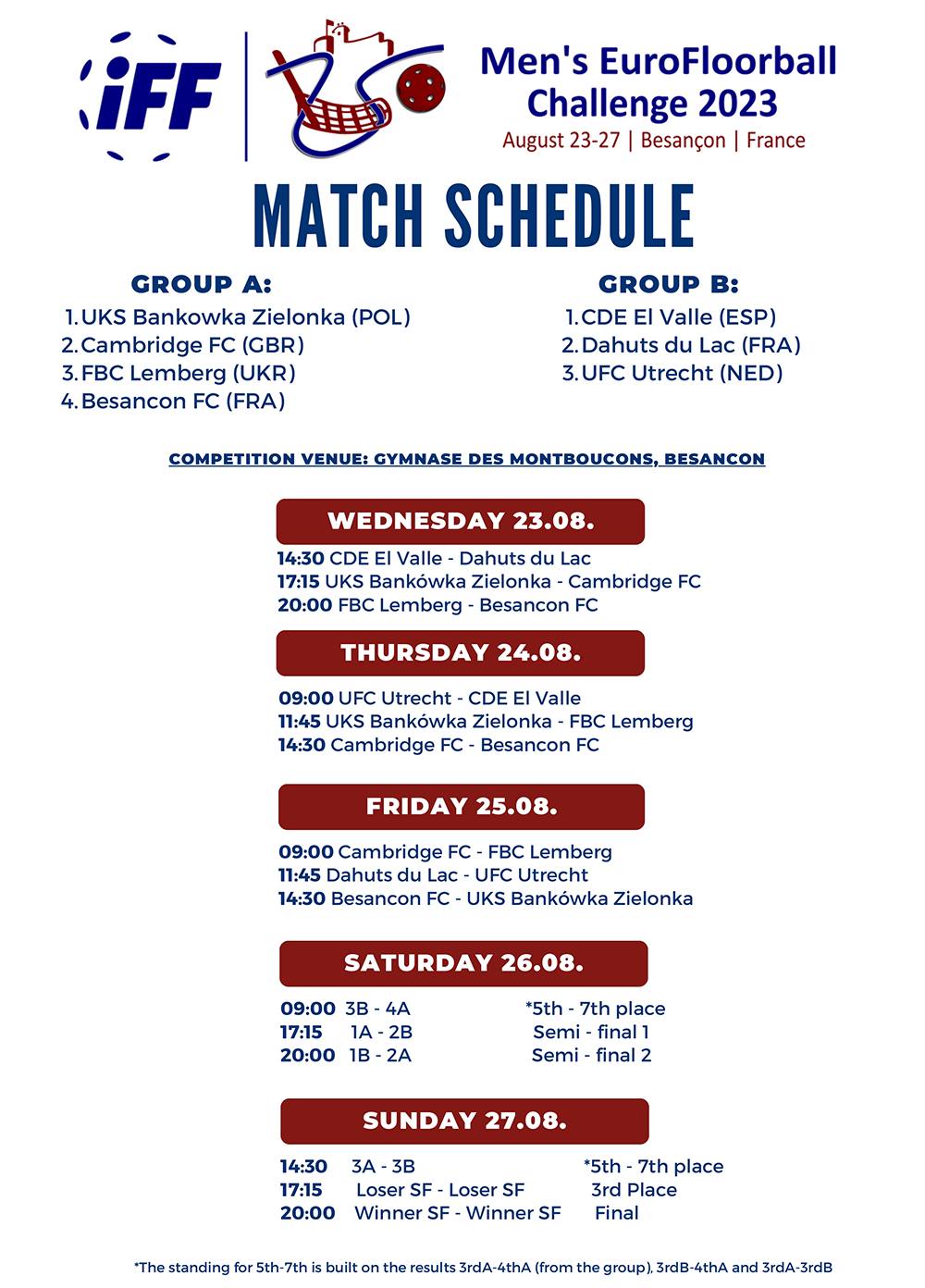 Cette année, l’organisation française de la compétition permet aux deux meilleures équipes de l’hexagone de participer. On retrouvera donc les finalistes du championnat 2022-2023, à savoir Les Dahuts du lac et les Dragons Bisontins. Comme lors de la finale en juin, on attend beaucoup de supporters des deux équipes à Besançon ! Sevrier et Besançon sont placés dans deux groupes différents et auront besoin de soutien face aux autres champions européens. Groupe A